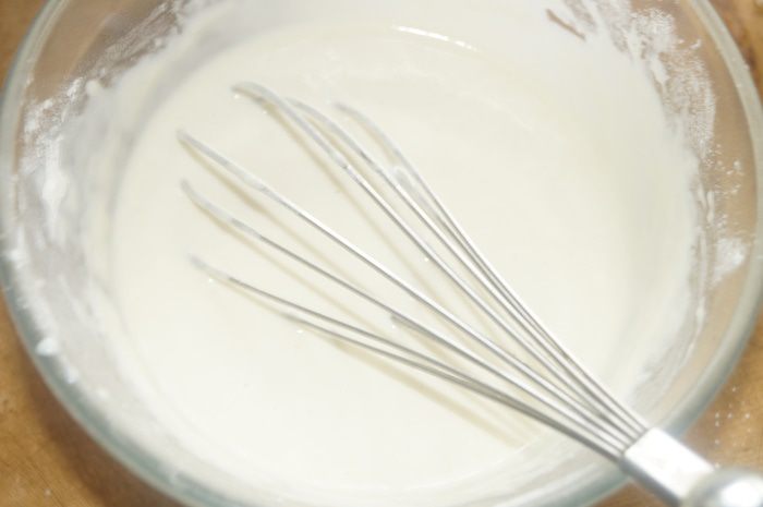 В молоке растворить соль, добавить яйцо и растительное масло, перемешать. Затем небольшими порциями всыпать всю муку, смешанную с разрыхлителем. Хорошо перемешать, получится довольно густая масса.