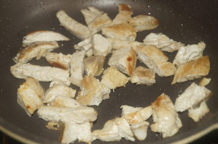 Куриное филе промыть, обсушить, натереть перцем и солью, нарезать кусочками и обжарить на растительном масле до золотистой корочки.