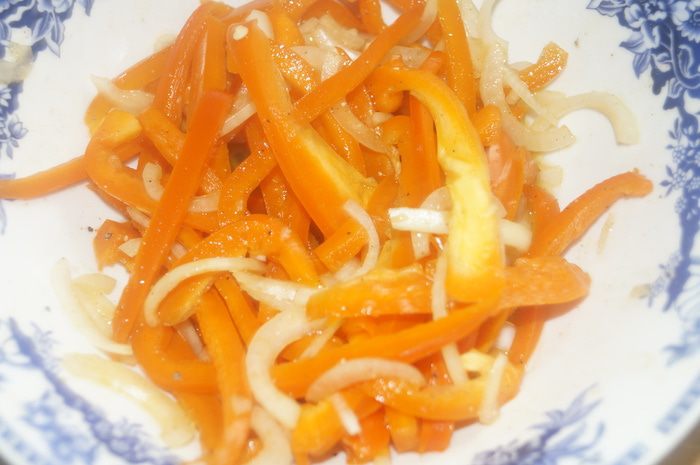 Болгарский перец нарезать тонкими полосками, лук нарезать полукольцами, переложить овощи в чашу, посолить, поперчить, добавить укусу и перемешать. Оставить минут на 20.