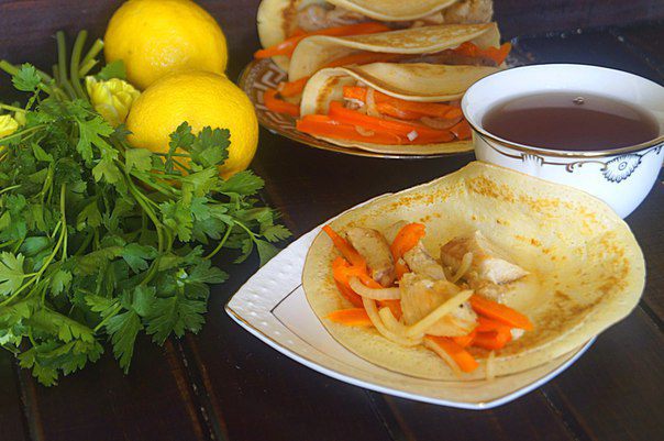 Если вы любите Такос или другие лепешки с начинками, то эти блинчики точно для вас. Свежие хрустящие овощи, слегка замаринованные и курочка в чудесных аппетитных блинчиках. От такого блюда будут в восторге все и мужчины, и женщины.