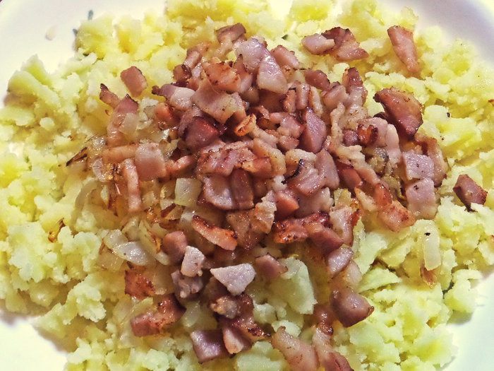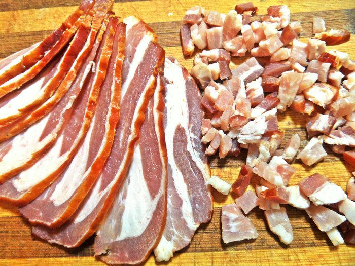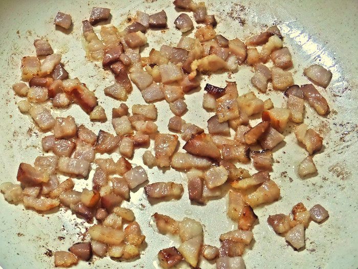 Бекон нарезать мелкими кубиками.