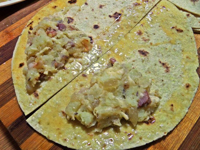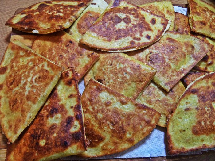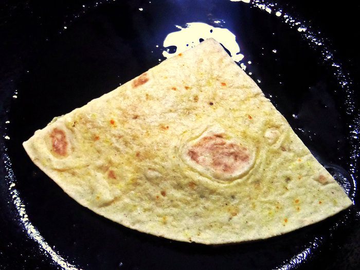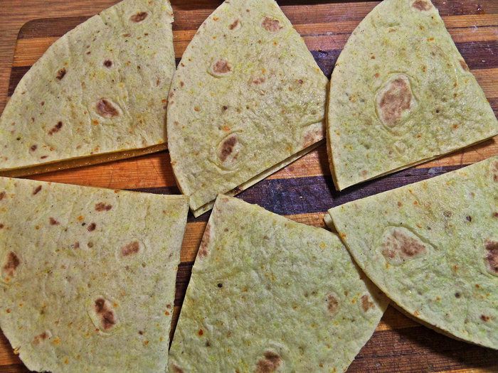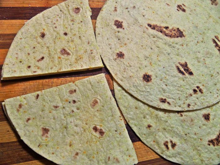 У меня цельнозерновые тортильи, но это не так важно, главное — идея! Нужно сложить лепёшки пополам и разрезать на 2 части.