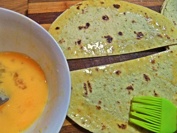 Возвращаемся к тортильям. Взбиваем яйцо и промазываем кисточкой края всех половинок лепёшек.