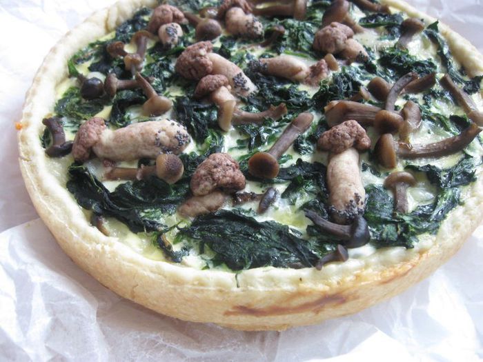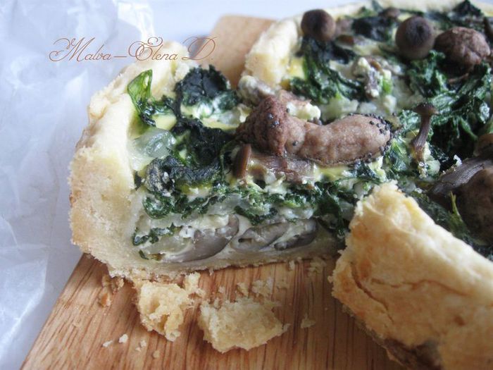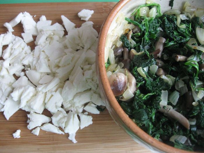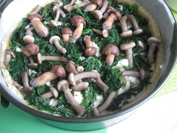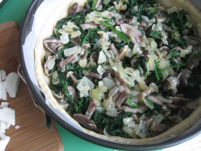 Смешать грибы, кроме тех, которые оставлены на украшение верха киша, с частью шпината.