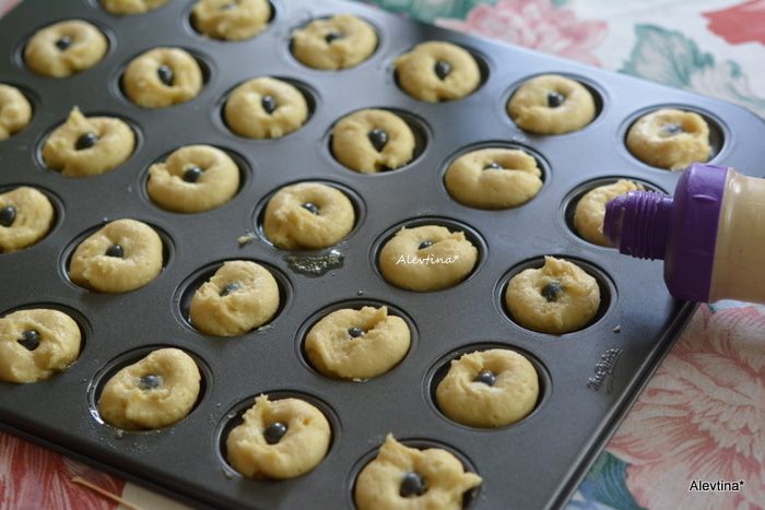Тесто лучше поместить в кондитерский мешок или в кондитерский шприц. Так они будет выглядит аккуратней. В каждую смазанную ячейку примерно по 1 ст. л. теста. Поставить в разогретую духовку на 8 минут.