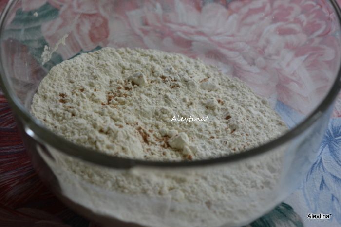 Смешать муку, разрыхлитель, соду, соль, мускатный орех. Отдельно смешать в емкости молоко и кефир. Отставить в сторону.