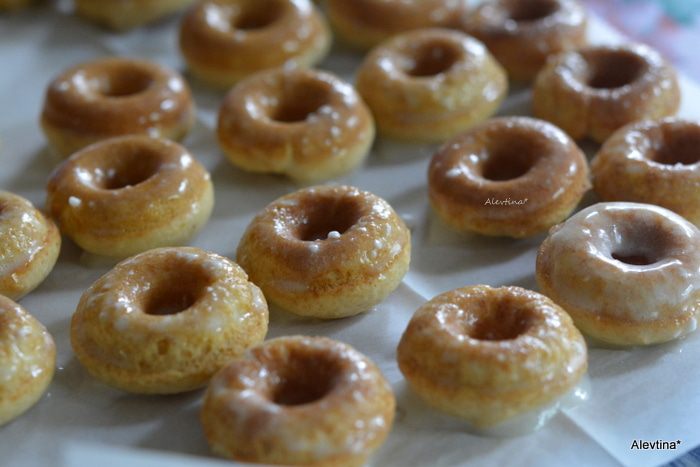 Окунать каждый пончик в глазури и выкладывать на противень или место с бумагой для выпечки.