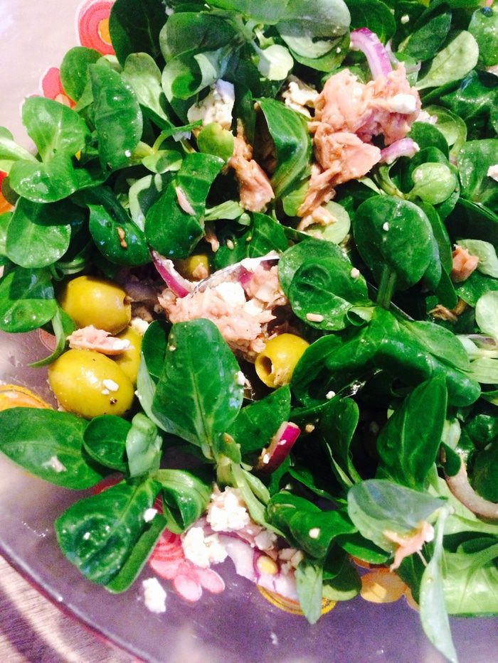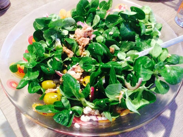 Добавить листья салата и оливки.