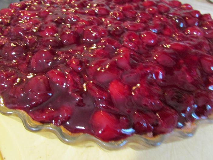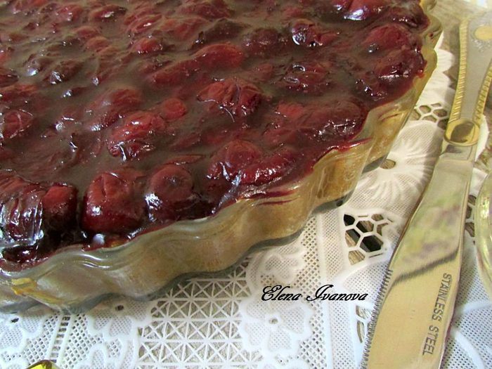 Затем извлечь пирог из духовки. Сверху выложить вишневый кисель, и отправить пирог обратно в духовку, еще на 10 минут.
