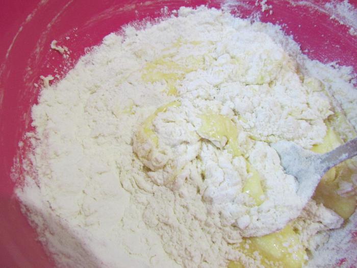 Добавить яйцо, муку и разрыхлитель. Замесить мягкое тесто.
