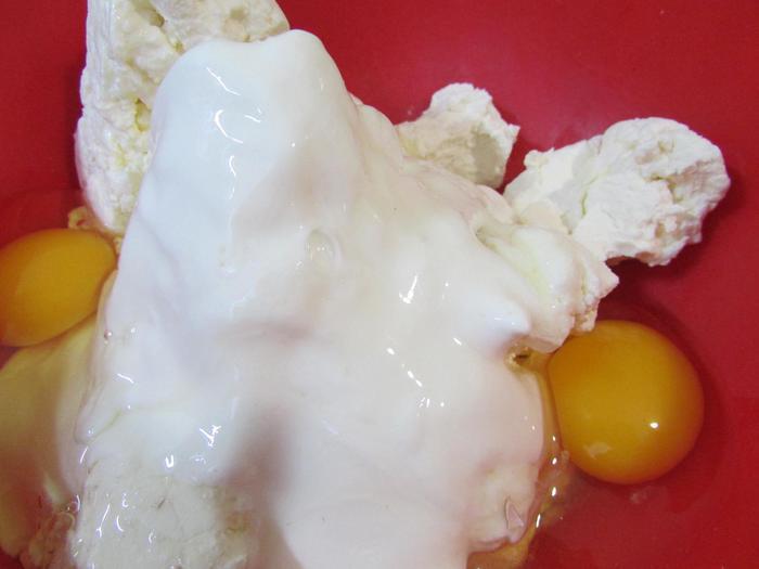 Приготовить творожную начинку. В миске соединить творог (пастообразный), яйца, сахар, сметану и ванильный сахар. Все хорошо вымешать.