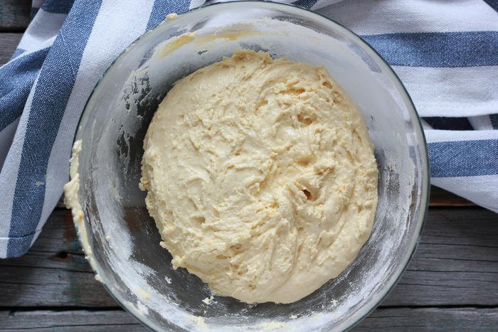 Сформировать из теста плоский рулет. Противень выстелить бумагой для выпечки, смазать сливочным маслом, и выложить тесто и отправить в разогретую до 190°С духовку на 30 минут.