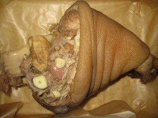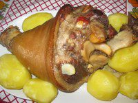 Когда рулька сварится, вынимаем ее из кастрюли и выкладываем на противень в котором будет выпекать. Воду не выливаем, ей будем поливать рульку. Рульку нашпиговать чесноком. Выпекать 40 минут, периодически поливая водой.
