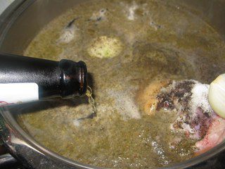 Доводим до кипения, бросаем 2 луковицы разрезанные наполовину. Вливаем темное пиво. Закрываем и рулька должна вариться около 3 часов.
