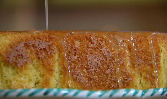 Готовый кекс перевернуть на блюдо и полить горячим сиропом.