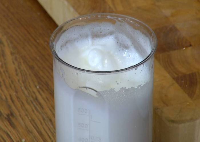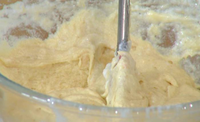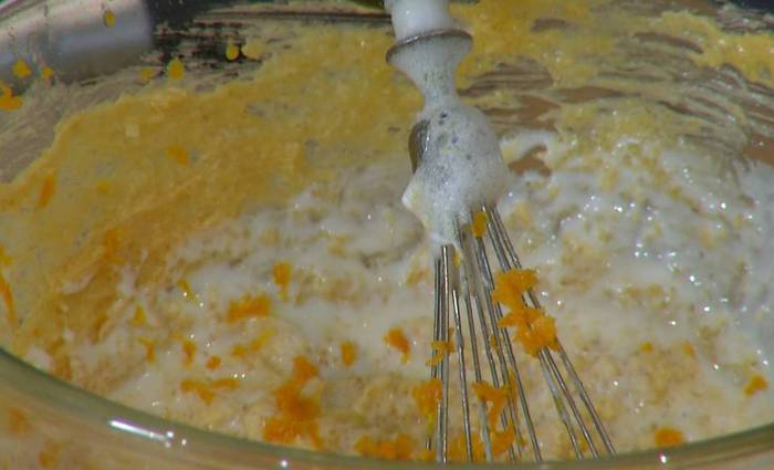 Желтково-сливочную массу взбить на невысокой скорости блендером с насадкой-венчиком, затем добавить закваску, цедру апельсина и половину апельсинового сока, перемешать все лопаткой.