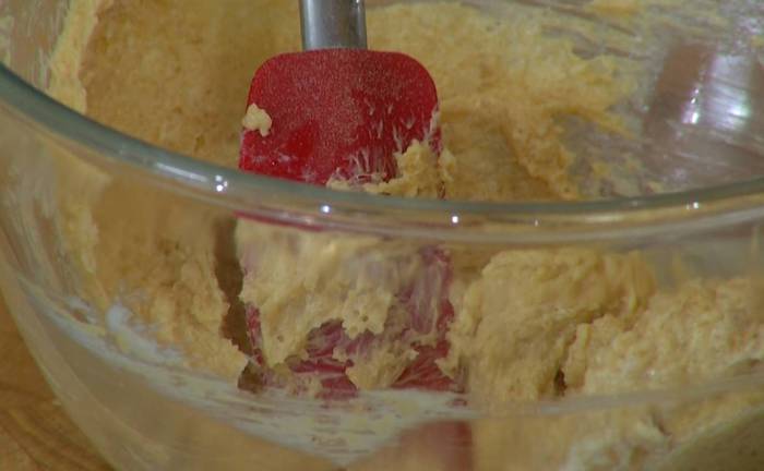 Муку с разрыхлителем небольшими порциями вмешать в желтково-сливочную массу. Затем частями ввести взбитые белки и вымешать тесто.