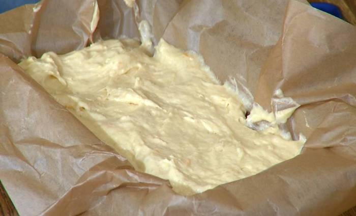 Продолговатую форму выстелить бумагой для выпечки, выложить тесто и разровнять его.