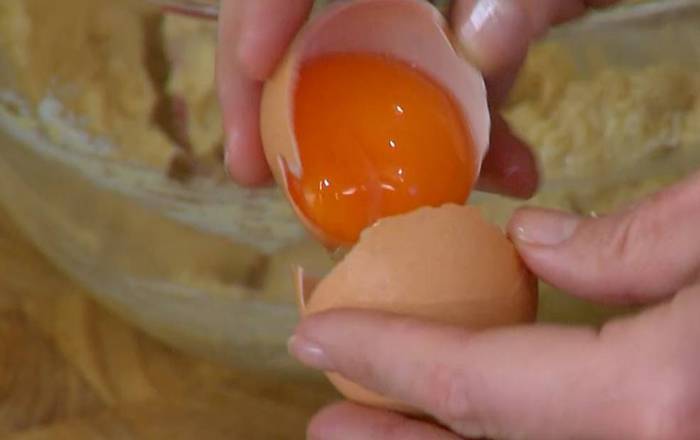 Желтки по одному ввести в сливочно-сахарную массу, каждый раз вымешивая лопаткой, затем влить апельсиновый экстракт и еще раз перемешать.