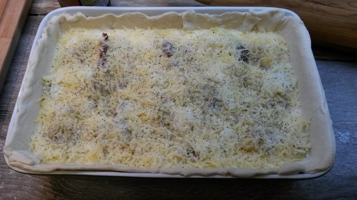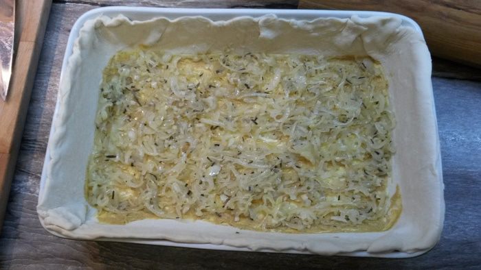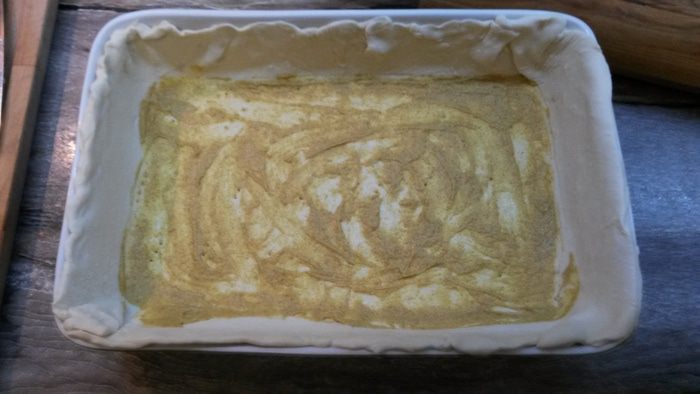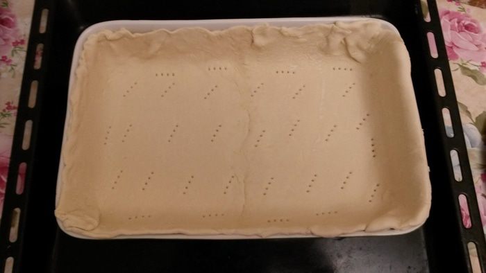 Слоеное тесто раскатываем по размеру формы, формируя высокие бортики. Накалываем вилкой.