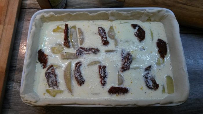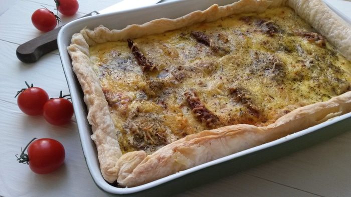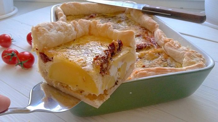 Сегодня хочу вас угостить картофельным пирогом с сыром и розмарином в сметанной заливке! А еще дома нашлось немного вяленых помидорок. Хрустящая слоеная основа и нежная, сочная начинка. Пальчики оближешь!