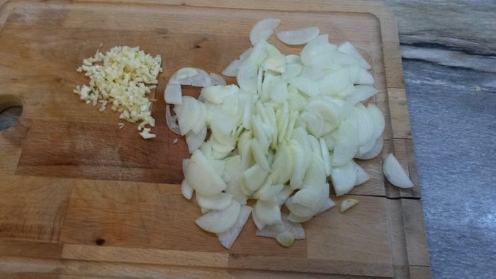 Лук нарезаем полукольцами, чеснок мелко рубим.