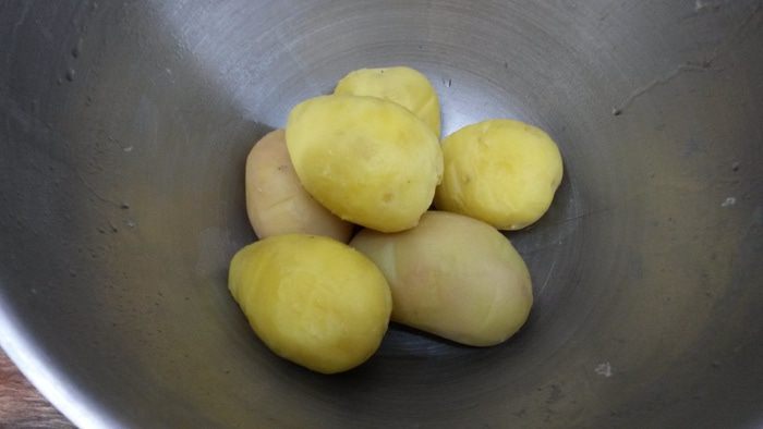 Картофель отвариваем заранее, очищаем и нарезаем дольками.