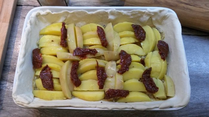 Далее выкладываем ломтики картофеля. У меня еще оставалось немного вяленых помидоров, поэтому и их добавила. Но они не обязательны.