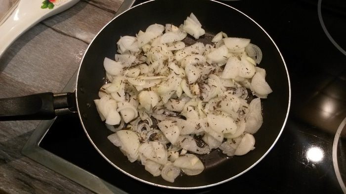 На растительном масле обжариваем лук 3-4 минуты, потом добавляем чеснок и мелко нарубленную веточку розмарина. У меня розмарин сухой. Лук готовим до мягкости и прозрачности. Ни в коем случае не пережариваем.