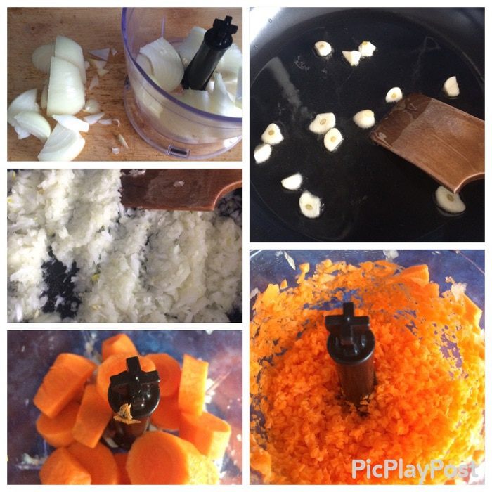Туда же отправляем нарезанный лук, я воспользовалась блендером (чтобы дети не ковыряли лук, морковку, болгарский перец), обжариваем и добавляем тертую морковку.