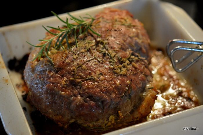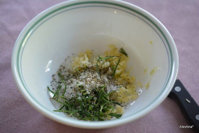 Розмарин свежий 4 ч. л., порезать мелко,добавить чеснок раздавленный или порезанный мелко, крупная соль и черный перец. Перемешать.