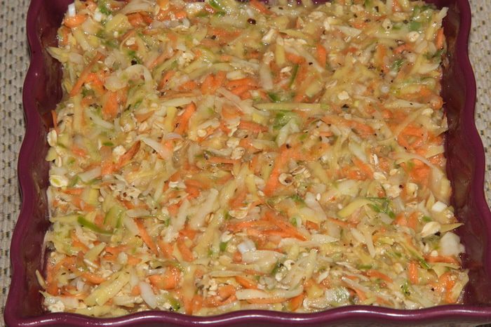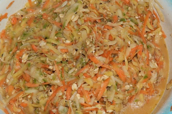 Ну что, девочки-красавицы, не пора ли после праздничных застолий перейти на легкую еду? Предлагаю испробовать овощной кугель. В оригинальном рецепте у автора использовались панировочные сухари, я заменила на овсяные хлопья №1, т. е. те, что нужно варить. Все остальное — по рецепту. Кабачки использовала замороженные, уже тертые. Получилось очень вкусно, легко, быстро.