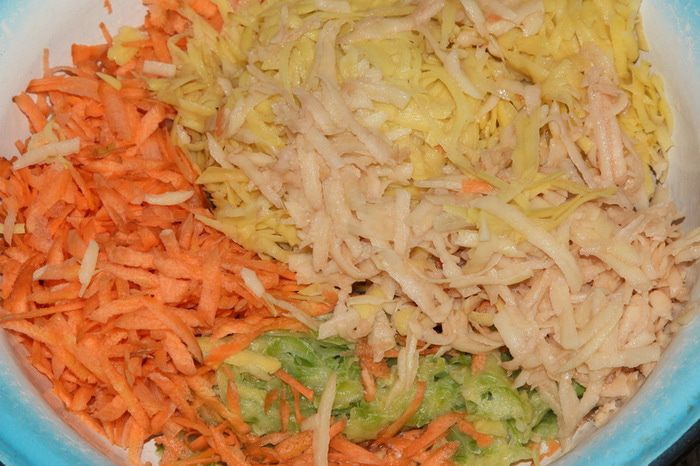 Кабачок натереть на крупной терке. Я разморозила готовую заготовку, сок сцедила — он не использовался. Картофель и морковь, довольно крупные, почистить и тоже натереть на крупной терке.