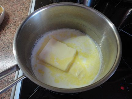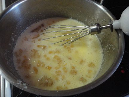 Желтки растереть с сахаром. Не обязательно добиваться растворения сахара. Да это и трудно сделать при таком объеме сахара на три желтка. Молоко закипятить. Плиту выключаем, но кастрюля остается на плите. Добавляем сливочное масло (молоко немного остынет, пока масло растопится) и частями добавляем желтки с сахаром, помешивая, чтобы сахар растворился.