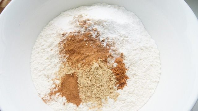 В миске смешать муку, пряности, соль, разрыхлитель и соду.