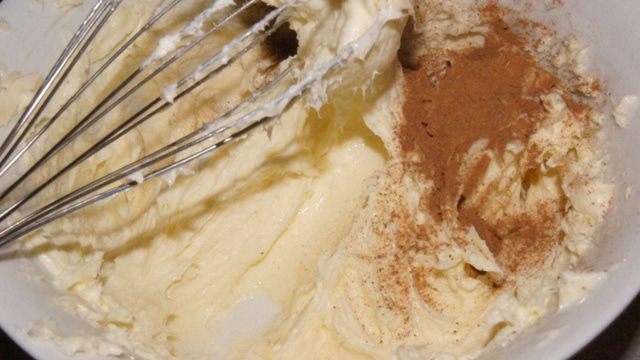 Сделать крем: взбить маскарпоне с сахаром, добавить размягченное сливочное масло, корицу и немного меду для гладкости.