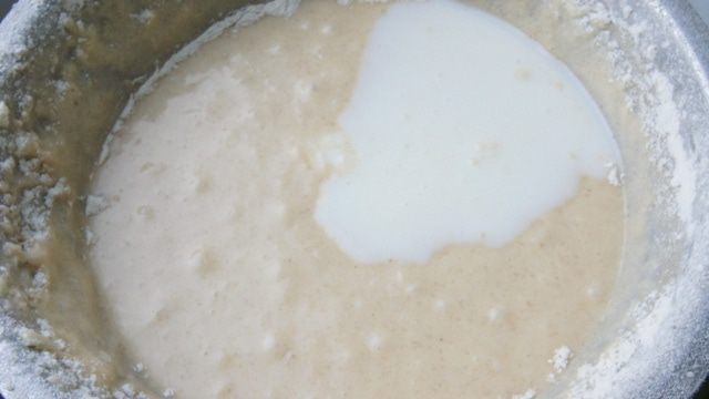 Теперь в тесто вводим сухие ингредиенты, попеременно с молоком. Перемешиваем до однородности.