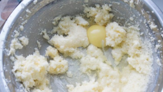 Размягченное сливочное масло взбить с сахаром. По 1 ввести яйца, продолжая взбивать массу.