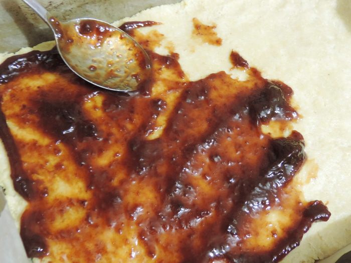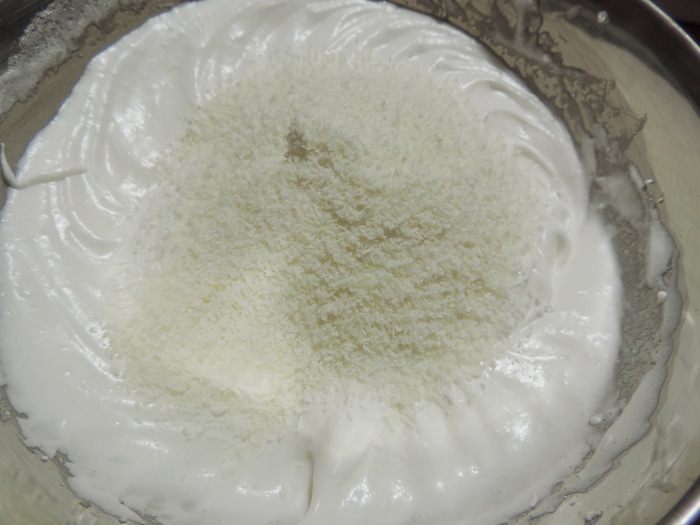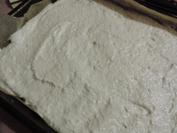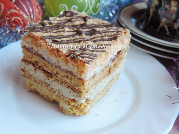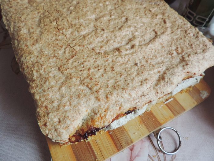 -песочный корж со сливовым повидлом и кокосовым безе.