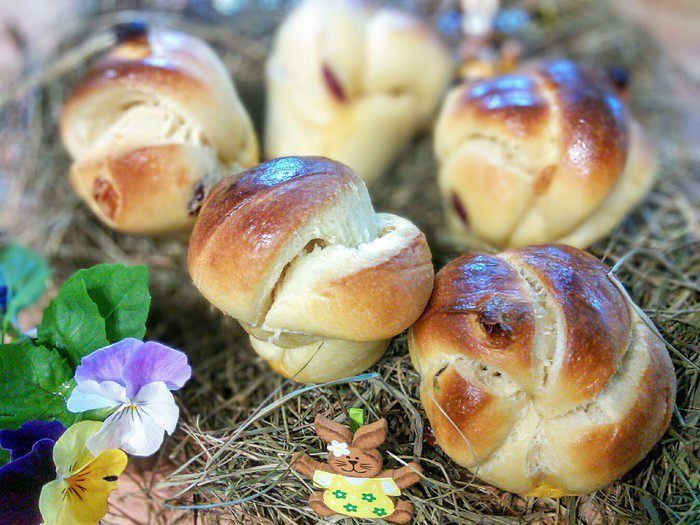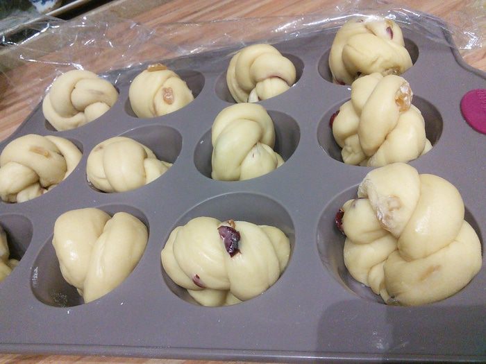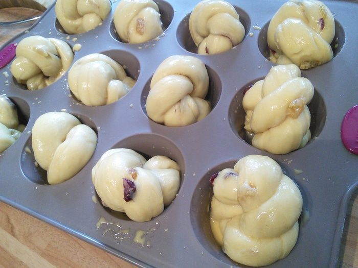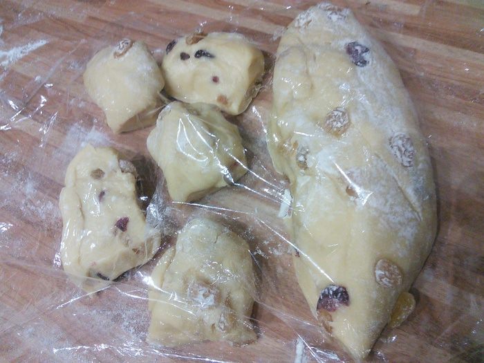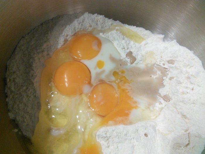 В чаше комбайна смешать муку, яйца, желтки и дрожжи (раскрошить) и месить на малых оборотах в течении 5 мин, затем добавить сахар и соль и продолжить замес еще 5 мин. Теперь добавить масло комнатной температуры маленькими хлопьями и продолжать замес, пока масло полностью вмешается в тесто. Теперь увеличить скорость до средней и замешивать в течении 10-15 мин. Тесто должно быть гладким, упругим, однородным и полностью отходить от стенок чаши комбайна.