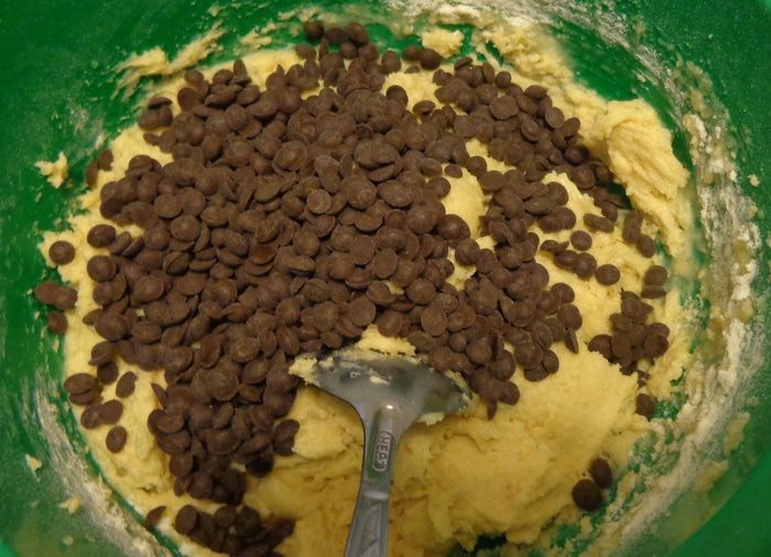 В готовое тесто положить шоколадные капли, перемешать.