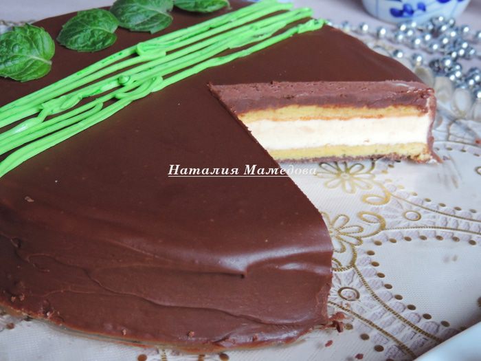 Нежный, пропитанный миндальный бисквит, вкусный масляный крем, обилие шоколада в двух ипостасях, мятный освежающий привкус — шикарный торт для любителей шоколада и не только.