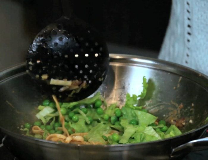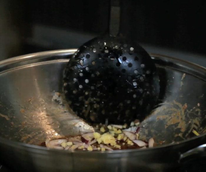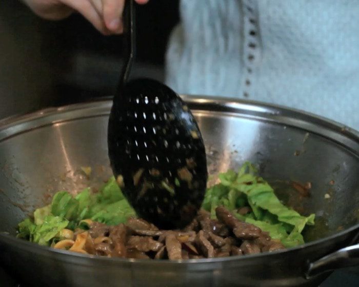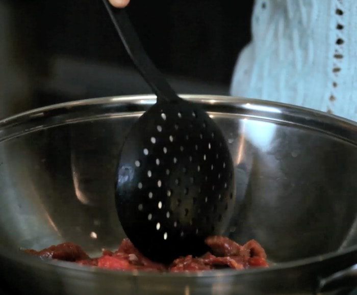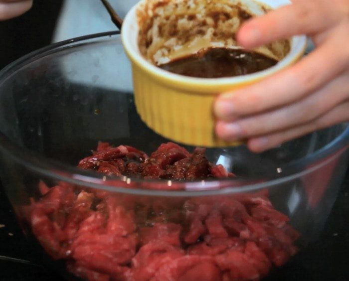 Тонкими полосками нарезать говядину. Сложить говядину в неметаллическую (!) миску и залить половиной пряной смеси. Накрыть плёнкой и убрать на 30 минут в холодильник. Перед готовкой оставить при комнатной температуре на 10 минут.