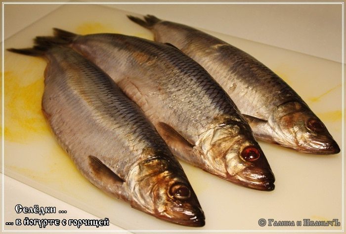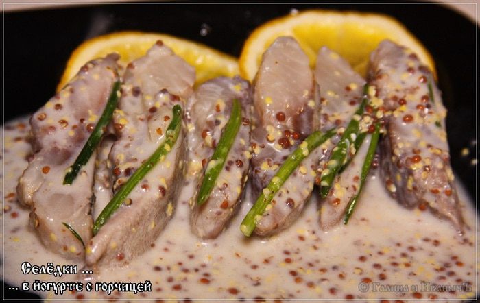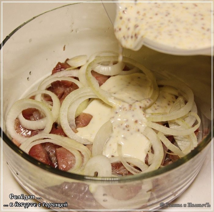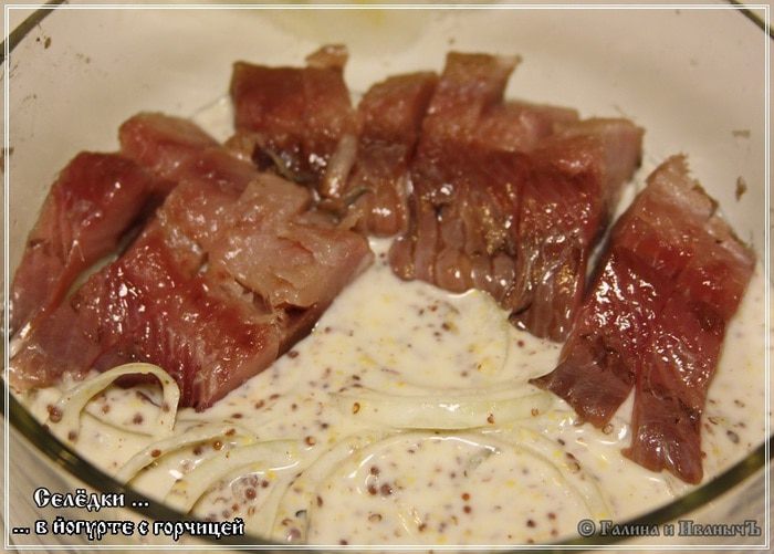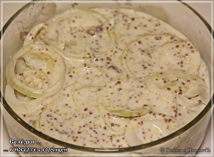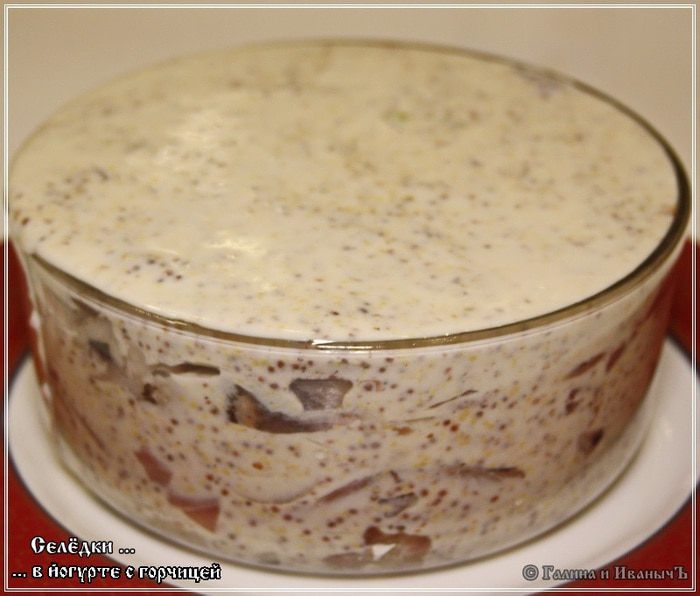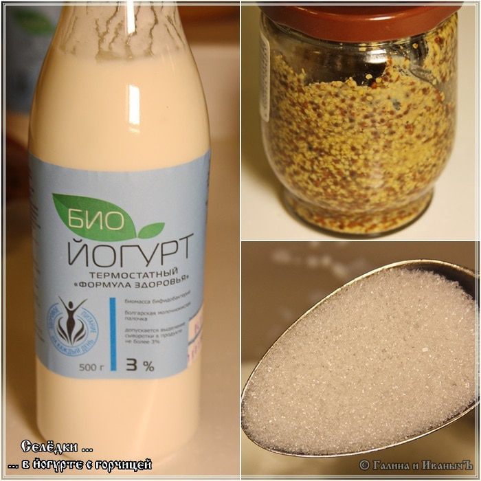 На три селедки, а они у нас был достаточно крупные, йогурта мы взяли 0,5 литра. Сахара — 3 столовые ложки. Горчицы — 3 столовые ложки.