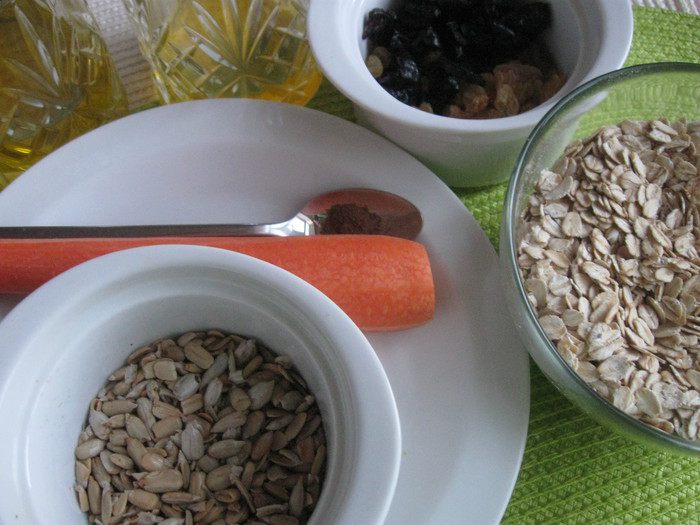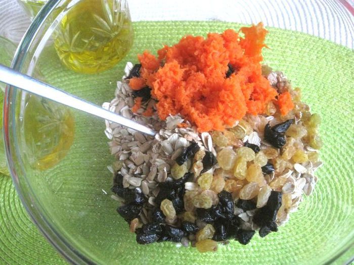 Морковь натереть на мелкой терке. Смешать овсяные хлопья быстрого приготовления, семечки, изюм, чернослив (нарезать мелко), морковь. Добавить мед, оливковое масло, молотую корицу. Хорошо перемешать.