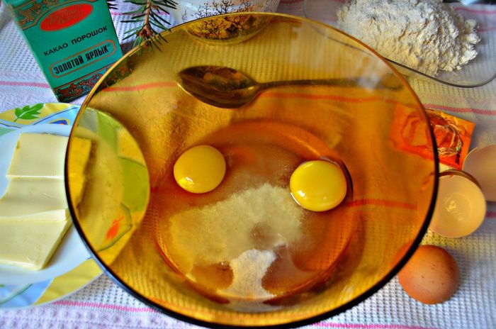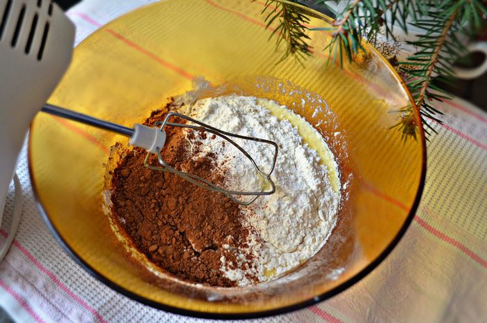Добавить просеянную с разрыхлителем муку и какао. Тщательно перемешать.