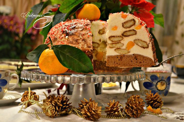Увидев рецепт этого торта, не смогла пройти мимо, тем более, что нужно было что-то решать по поводу праздничного десерта по случаю маминого Юбилея (как раз накануне новогодних праздников). Времени на приготовление торта в будний день было совсем немного, поэтому задача была не из лёгких. Рецепт не подвёл, правда, и претерпел мои небольшие изменения. Основа в этом торте из воздушного бисквита, чудесный сливочный мусс, любимое печенье савоярди со вкусом ароматного кофе и кусочки мандарина — прекрасно подружились между собой!! Торт не приторный, очень нежный, стал приятным завершением нашего праздничного застолья. Он настолько нам понравился, что муж даже попросил повторить его и в новогодние праздники. Приготовить такой торт можно заранее, да и готовится он достаточно быстро и просто, что не маловажно многим хозяюшкам. Так что не пугайтесь большого количества шагов в рецепте, просто мне хотелось всё подробно описать, чтобы было понятно и начинающим кулинарам. Думаю, что многие из вас сейчас в раздумьях, что приготовить в качестве десерта к старому Новому году, поэтому хочу с вами поделиться этим удачным рецептом! Приступим!