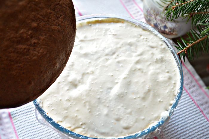 Корж часто проткнуть зубочисткой и сбрызнуть оставшимся кофе. Накрыть коржом крем и слегка прижать. Сверху покрыть плёнкой и убрать в холодильник на ночь.