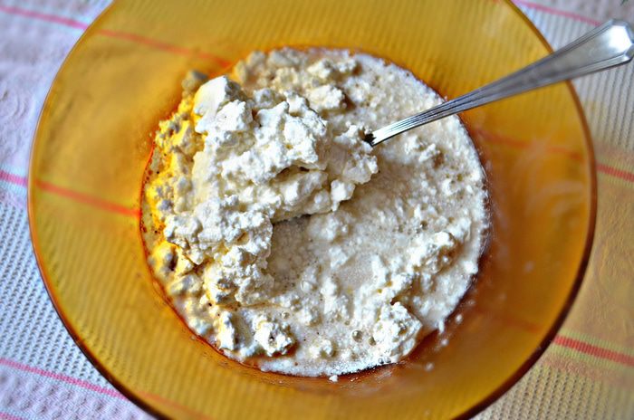 Как только масса в процессе охлаждения начнёт застывать, добавить творог и хорошо перемешать.