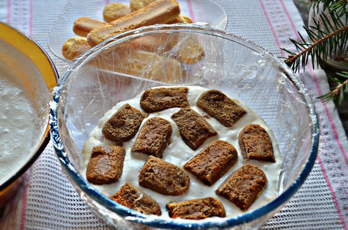 Слоями выложите подготовленный крем, печенье савоярди, пропитанное с двух сторон кофе (быстро обмакивая печенье в кофе, по принципу, как для тирамису).